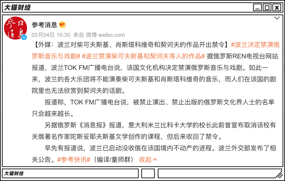 不少欧洲国家就给柴可夫斯基、肖斯塔科维奇、契诃夫等等大师的作品开出了禁令,《天鹅湖》这些剧就别演了。