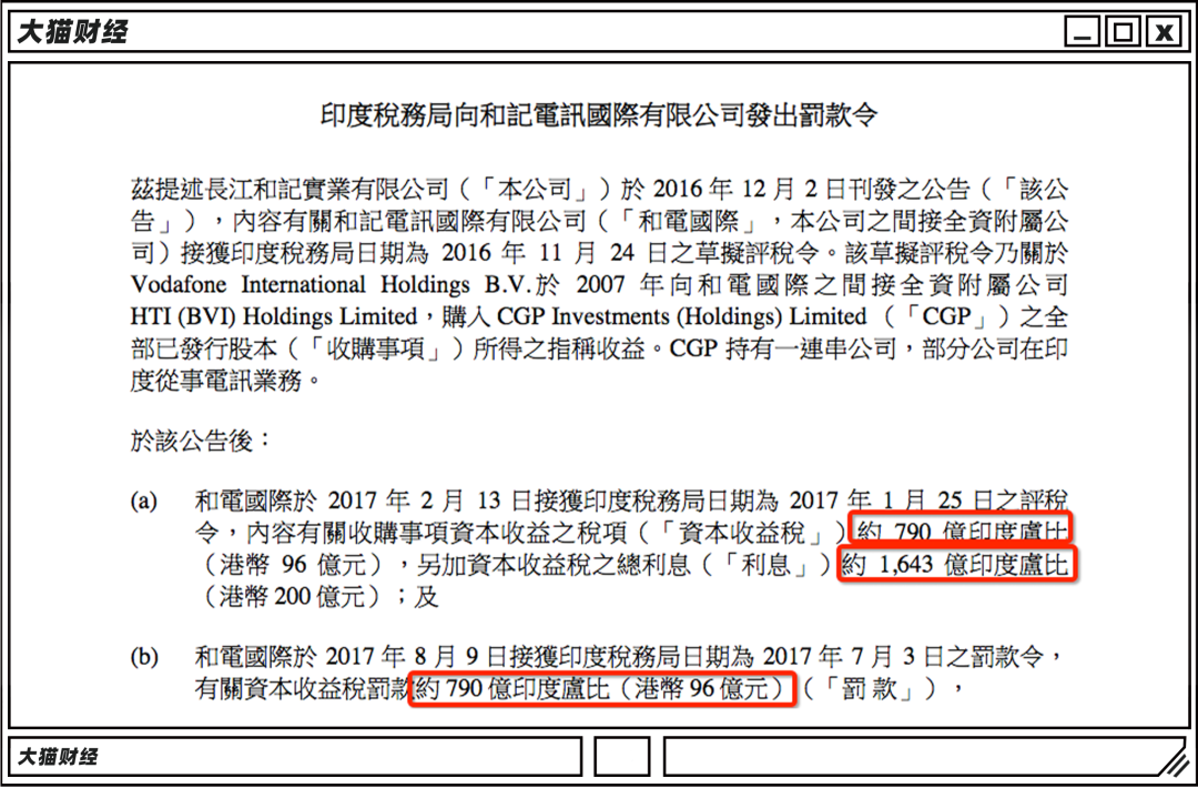 沃达丰不惜国际仲裁,最终印度的税务局败诉,你猜李嘉诚的和黄,会不会理这个无厘头的罚单。