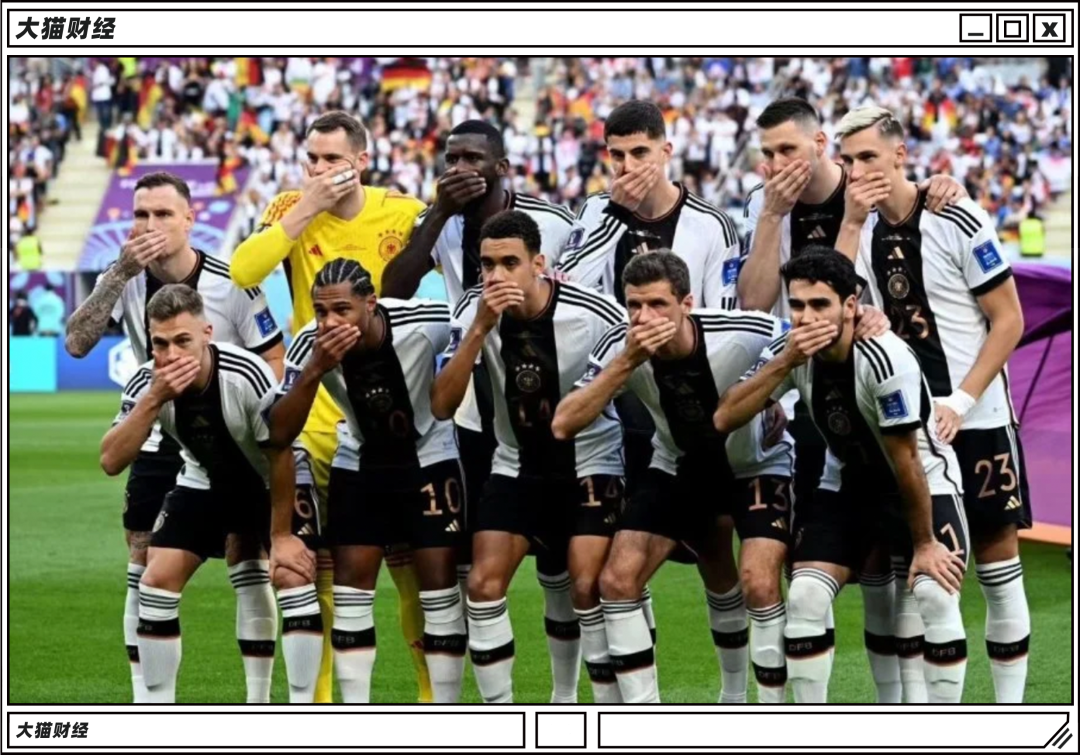这一看就是在内涵东道主,在卡塔尔,同性恋是非法的,男男性行为最高可判处七年徒刑。结果在国际足联的一顿强力压制下,这个臂章没能带入赛场,德国队的这个动作意思不言而喻。