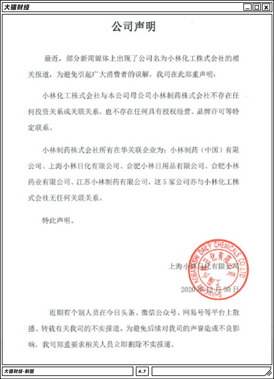 这可是个天大的丑闻,波及的范围相当得广,甚至逼得另一家跟他们“重名”的企业都不得不站出来澄清——我们公司叫小林制药,跟出事的小林化工是两回事。