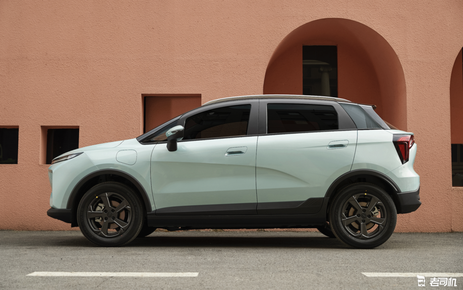 小型SUV的定位,几何E的个头并不大,新车长宽高分别为4006/1765/1550mm,轴距2485mm,更加适合城市通勤。侧面也是圆润的造型设计,前后轮拱和门板下方凸出的黑色装饰边框凸显了SUV车型的硬气。螺旋桨造型五辐低风阻轮圈简单美观。