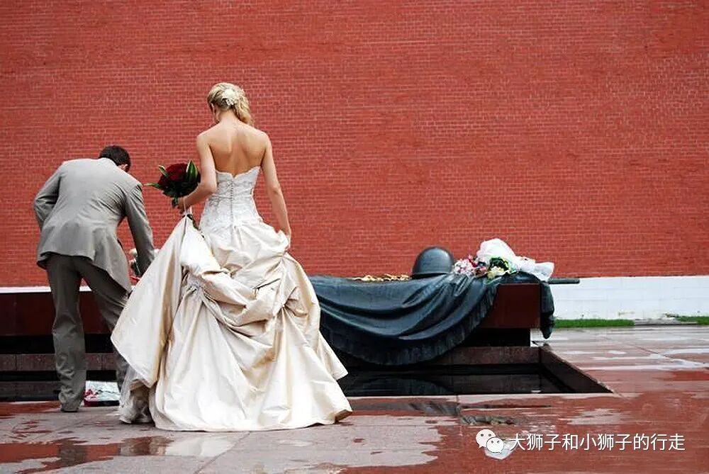 这是莫斯科延续至今的一项传统——新人结婚必到红场上的无名烈士纪念碑前敬献鲜花,它已成为莫斯科人举办婚礼必不可缺的一个环节。