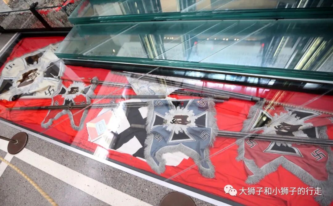 于是,苏联人把纳粹德国的各种旗帜铺到参观路线的走道上——虽然还隔着钢化玻璃,但是不是也有一种被“随意践踏”的感觉?
