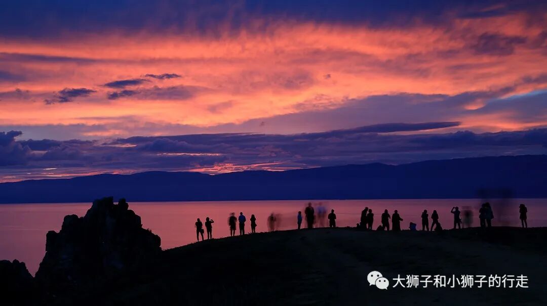 贝加尔湖对岸的火烧云慢慢燃至饱和,岸边的游人驻足于整个山脊。