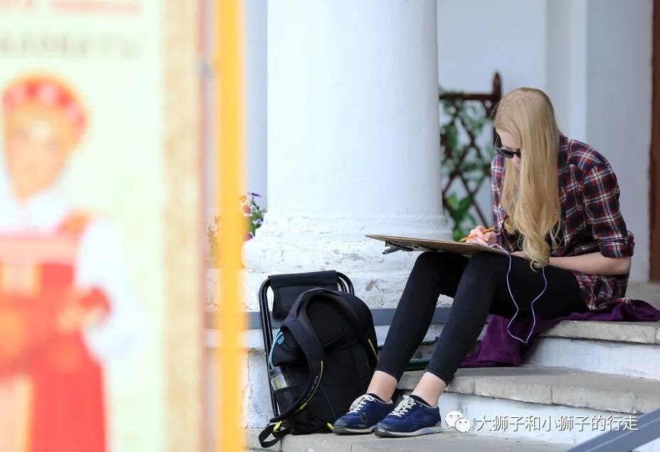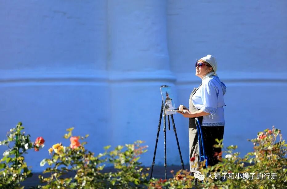 那就也发一张俄罗斯老太太的照片吧——拍摄于俄罗斯的谢尔盖耶夫,老太太是个画家,在教堂的一侧写生;抬头的那一瞬,足具气质!