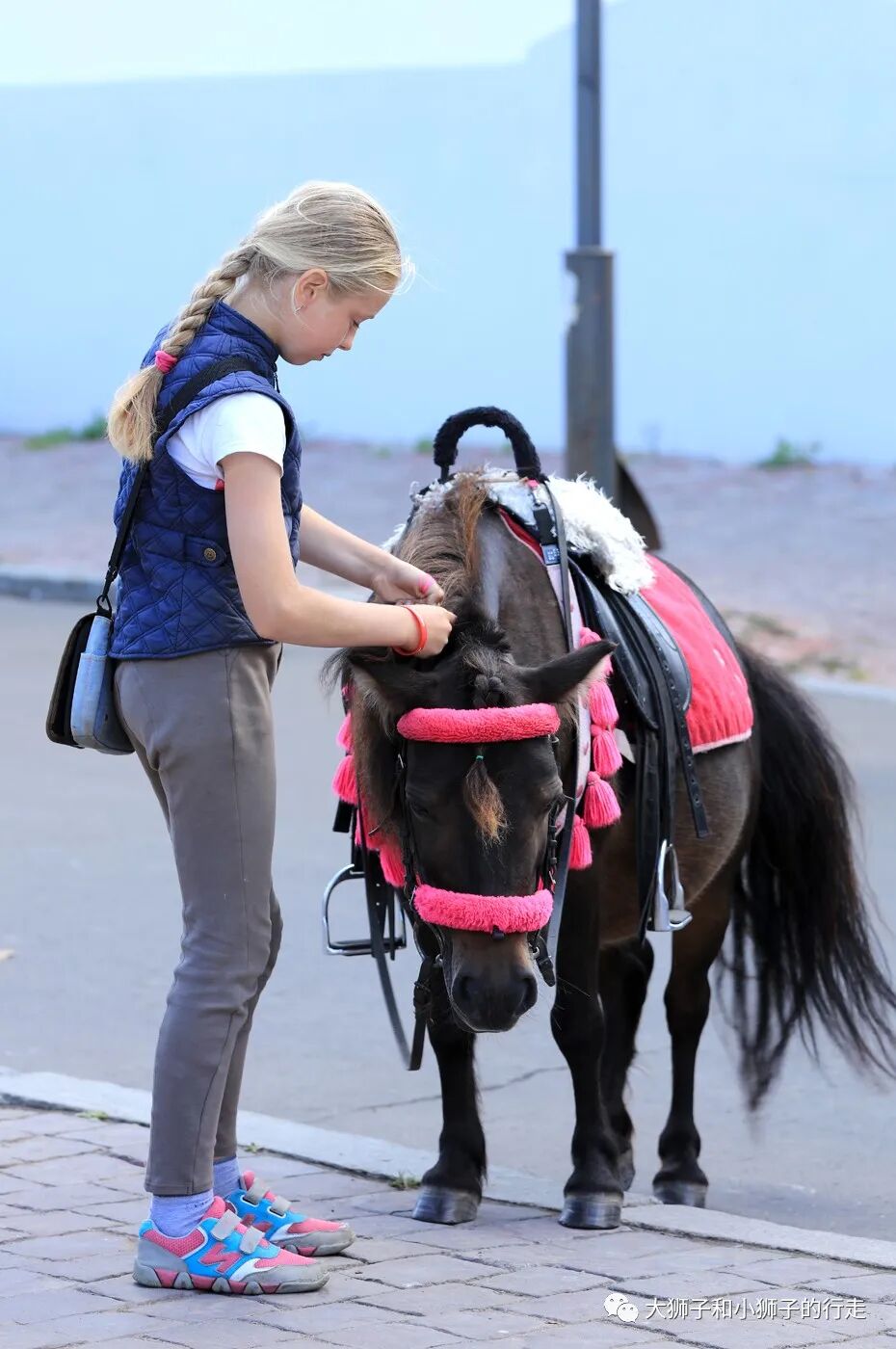 苏兹达利的旅游区,俄罗斯小女孩牵出自己的小马,给到这游玩的孩子们骑乘,自己挣点零花钱。