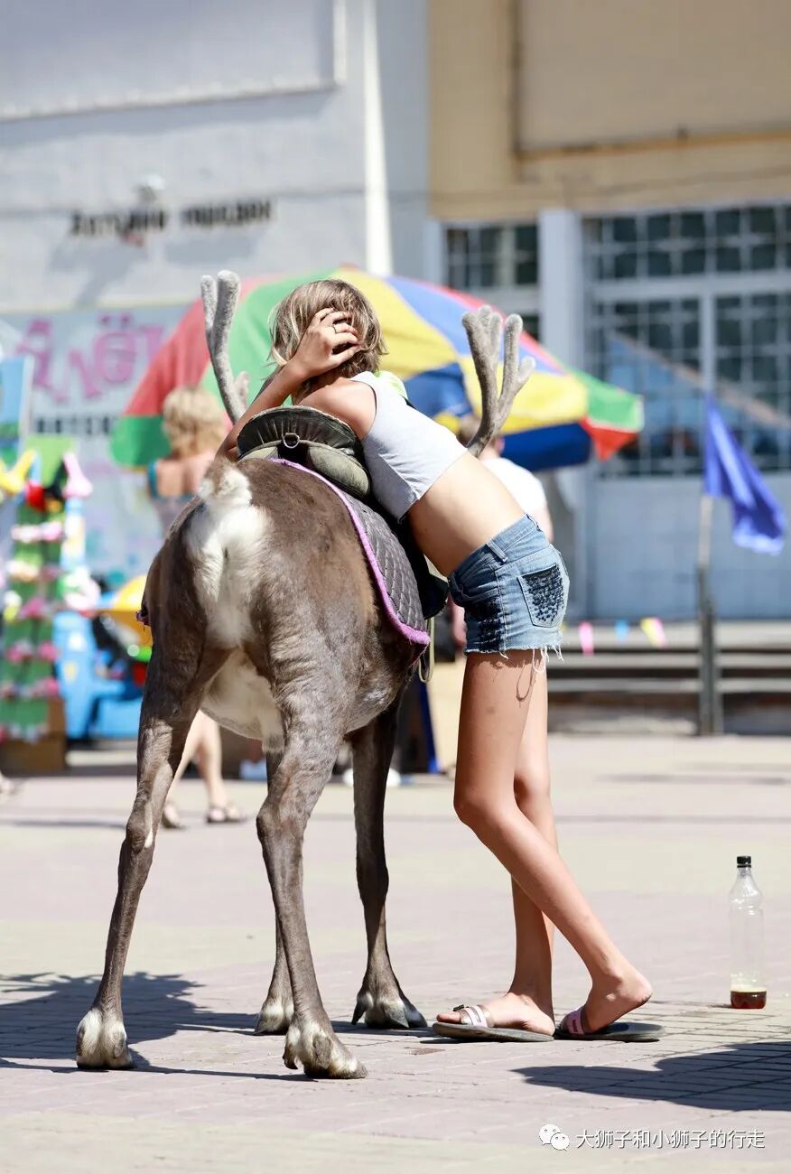 这两张是把自家小马或驯鹿拉出来给孩子们骑乘,挣点钱补贴家用的女孩。
