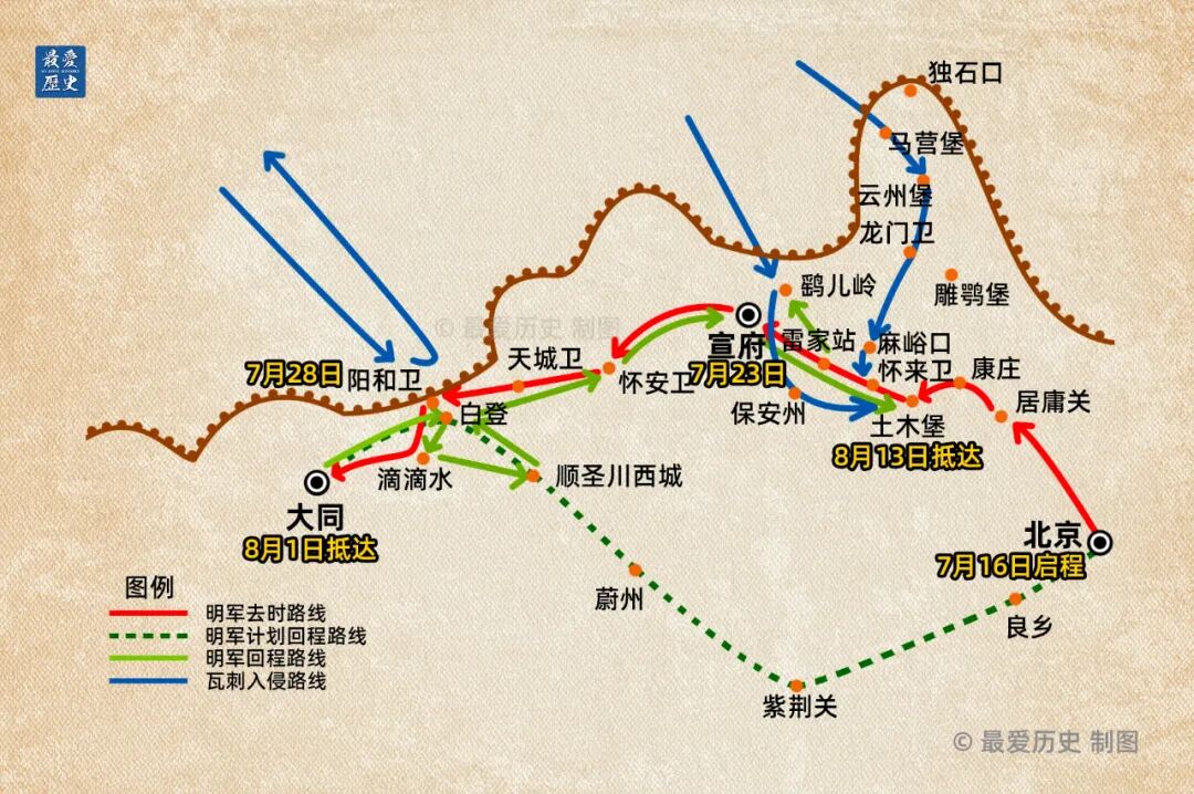这个方案,王振和明英宗起初都是同意的。可大军后撤还不到四十里,王振就发现从大同往紫荆关方向撤军,势必要经过他的老家山西蔚州(今河北蔚县)。他怕几十万大军从家乡过境,一定会损坏家乡的农田作物。于是,在他的怂恿下,明英宗下令明军改变原来的行军路线,转至宣府入关。这么一番折腾下来,明军撤退的时间完全耽误了。