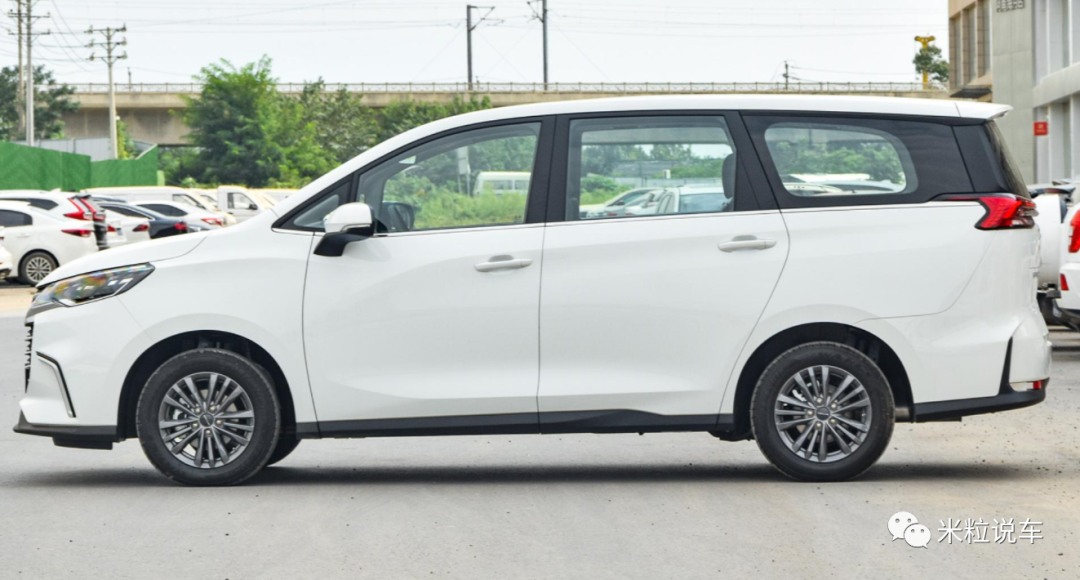 从侧面来看,这是一款家用级别的MPV。为何这么说呢?因为新车并没有采用中大型MPV的移滑门设计,但好在依然配备了悬浮车顶,充满棱角的线条以及旋风造型的铝合金轮毂,具有着较强的设计审美。
