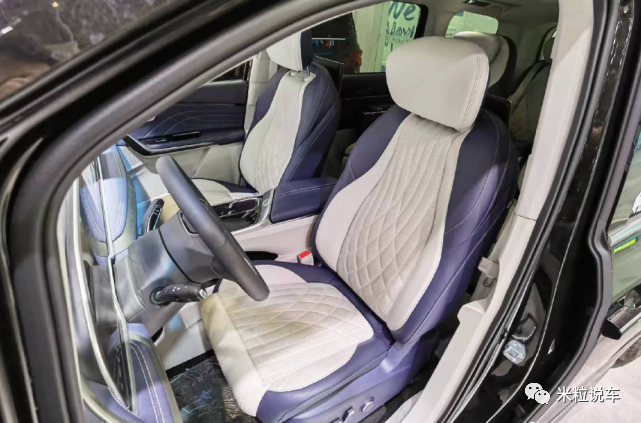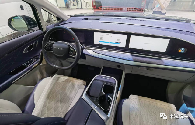 这款新车的内部采用了众多新能源汽车最喜欢使用的设计,中控台搭载了三块贯穿式的内嵌式大屏,不过这三块大屏并未彼此打通,但是配备了协同功能,视觉感官上和豪华品牌的电动车还是有一定差距的。空调控制区域采用的是触屏设计,可以在金属面板上进行操控,这样的设计还是比较新奇的。此外,还拥有更具手感的双幅方向盘,双拼色的打孔座椅以及豪华的中央扶手,其中中央扶手上拥有水杯,杯架,手机无线充电功能以及超多的金属装饰面板。