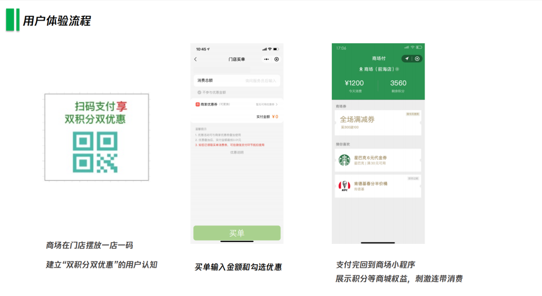 对于商场内的美妆、服饰、电子等其他消费业态,商场小程序也可以借助“商场付”能力,通过高频流量和积分吸引其他业态发券和预购,由商场利用商场物料和小程序建立用户触点并制券发放,门店则负责承接客流和支付核销一体化。