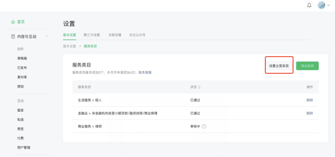 1、登录小程序管理后台,通过【设置】-【基本设置】-【基本信息】-【服务类目详情】-【设置主营类目】操作主营类目设置。