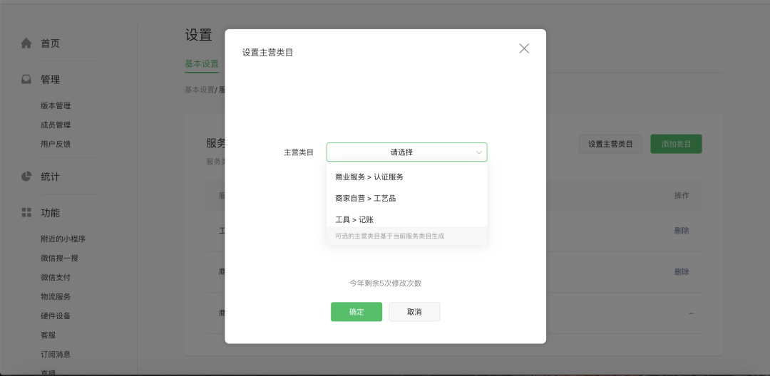 2、可选主营类目基于已通过的服务类目生成,开发者需结合小程序主要运营服务内容,正确选择主营类目。