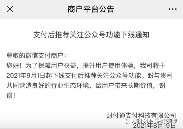 2、公众号可以给小程序导流,小程序也一样可以给公众号回流。线下直接扫码小程序支付后可以推荐关注公众号,是服务号,微信商户号和小程序,公众号三方是一致的才可以。但是去年微信支付还是下线了支付后推荐关注公众号功能。