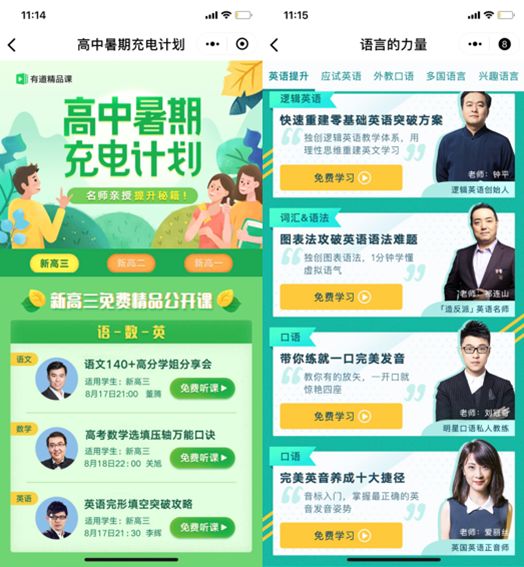 以小程序【有道精品课】为例,iOS端将所有付费内容更改为免费,原【付费解锁】,现已完全免费使用。比如: