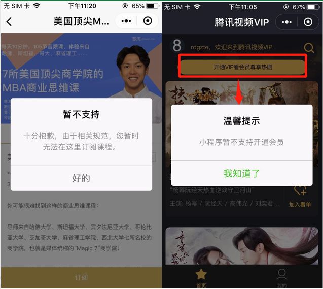 以小程序【网易公开课精品】、【腾讯视频VIP】为例,iOS端点击订阅、开通VIP服务,前端直接拦截提示不可服务。但,如果页面呈现货架价格,提示购买行为的(如问题2),将会被拒绝。比如: