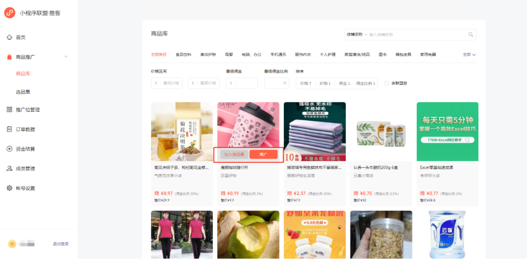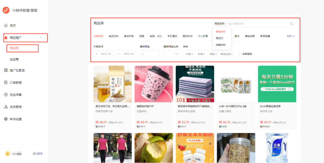 2、注册完成后,点击【商品库】,即可看到各个类目下的商品,可根据类目或佣金比例,价格区间进行筛选,选择您想要带货的商品,也可通过商品名称/商品ID/店铺名称进行定向搜索