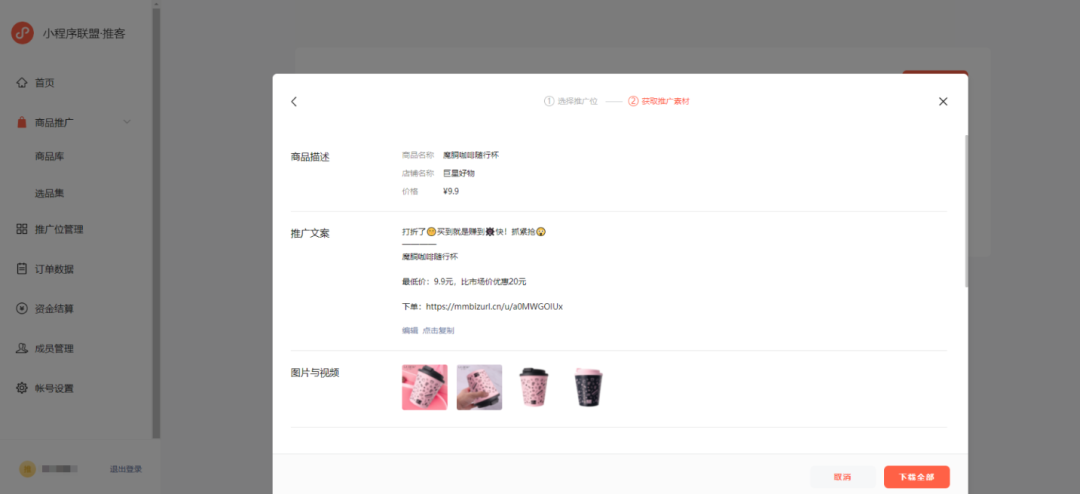 ①推广机构可以点击选品集,将选品集的商品设置给推广者进行推广,推广者下载相关商品资料进行推广