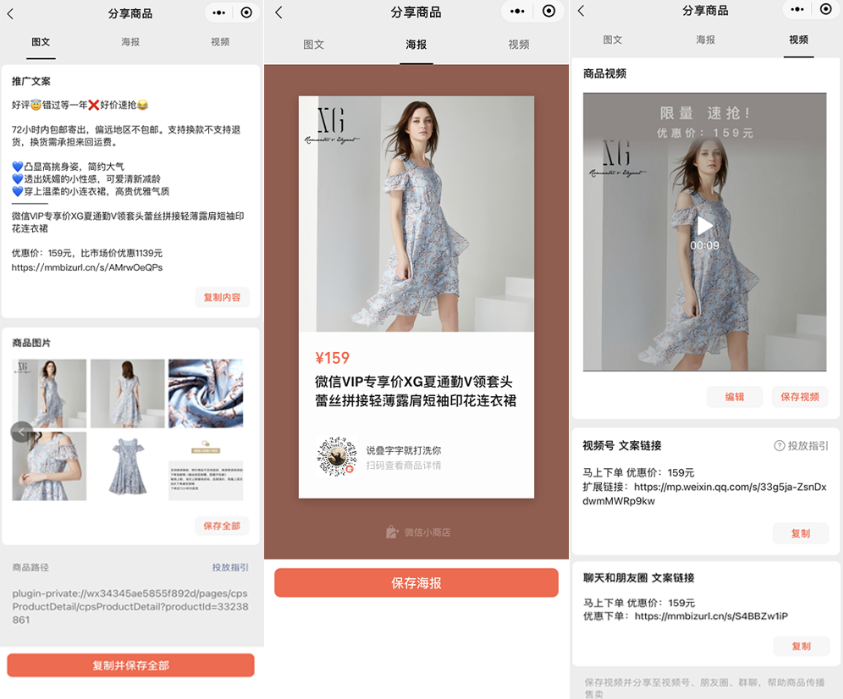 点击【分享】,即可生成图文、海报及商品视频,商品链接等,您可以分享链接或海报到微信群、微信聊天、朋友圈等进行销售分享带货,可以保存视频发布到视频号进行带货等等,还可以在带货订单中查看订单明细哦~