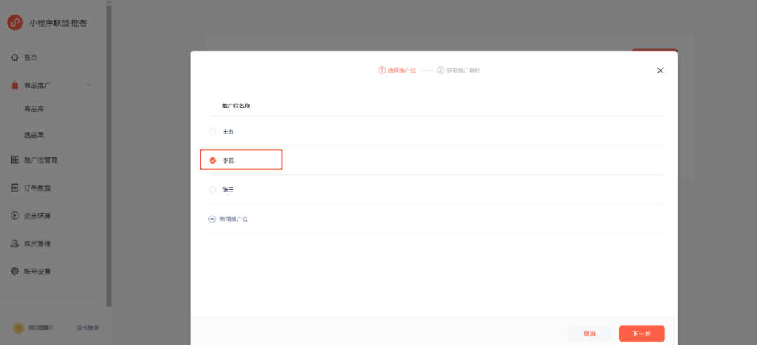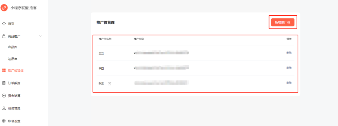 4、点击【推广位管理】,推广位ID是机构在小程序联盟为推广者分配的账号,可以增加或删除相关账号,也可以自定义名称