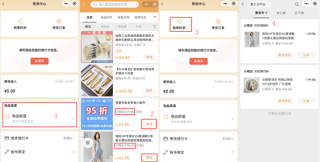 ②推广者可以在手机端进行带货,进入自己的小商店后,点击【带货中心】-【商品联盟】,选择小商店的商品,点击【带货】,即可在【我带的货】列表中,看到所有带货商品,同时,带货商品会展示在您的小商店里面,用户点击可跳转购买【注:带货商品不会展示在您的后台销售中列表】