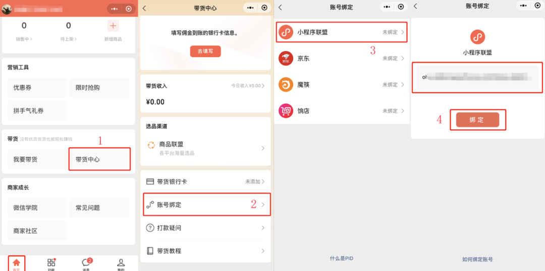 机构把推广位ID发送给推广者后,推广者可以在手机端进入自己的小商店首页,点击【带货中心】-【账号绑定】,选择【小程序联盟】,输入你的ID后点击绑定,即可绑定推广者关系