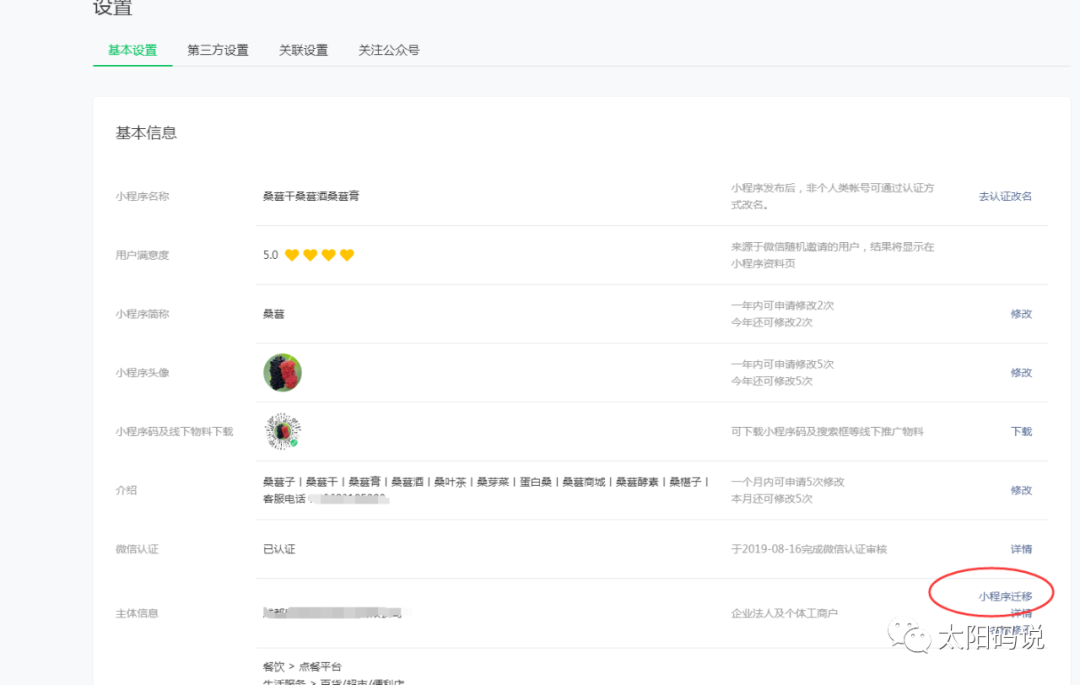 2、点击右上角进入小程序基本设置,在主体信息右边,有一个小程序迁移。