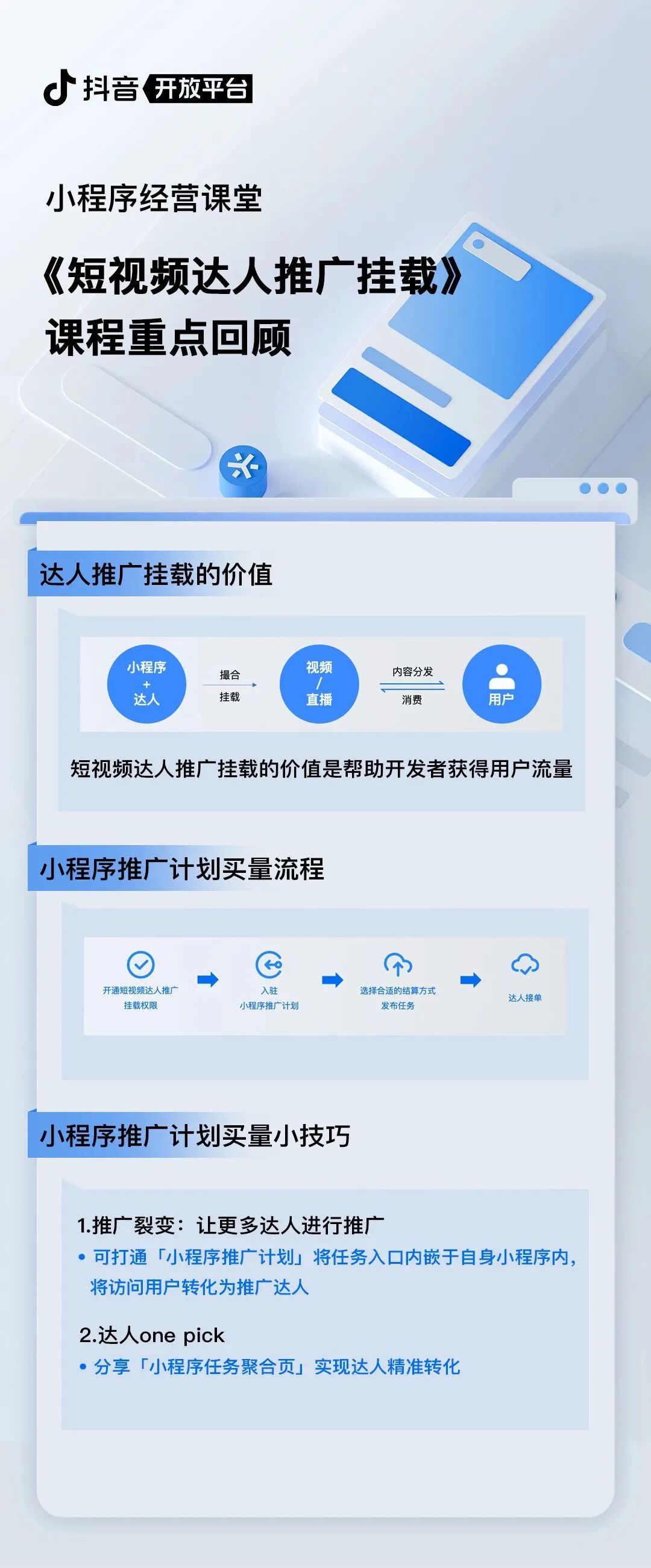 以上是小程序经营课堂第四期《小程序挂载专题——短视频达人推广挂载》的课程内容回顾,完整课程内容可至「抖音开放平台-学堂」中查看。