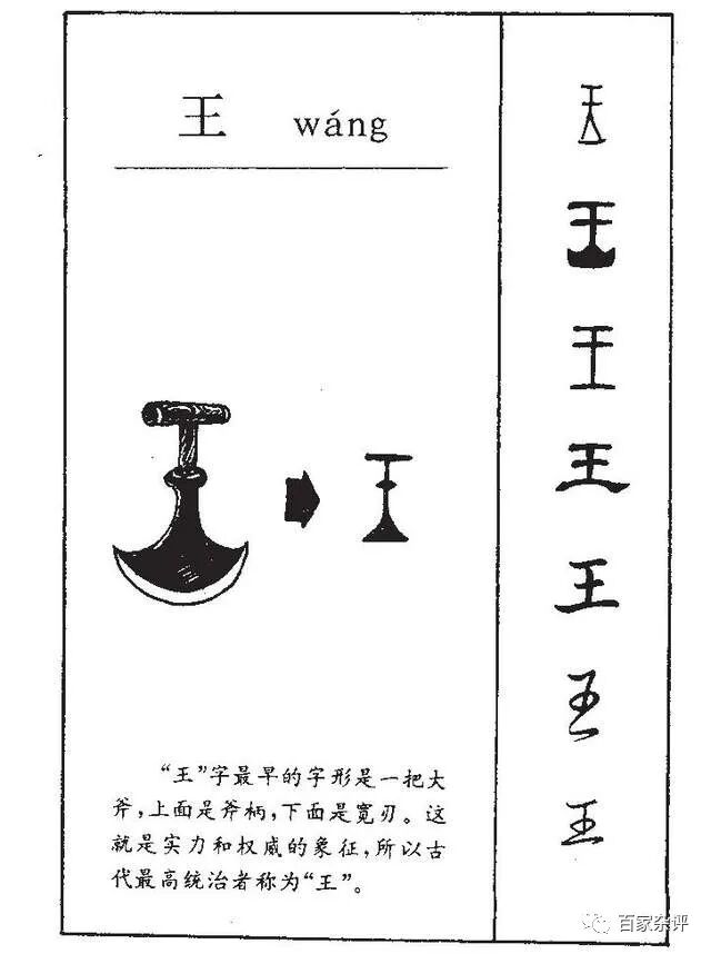 甲骨文中的“王”,直接且凶狠,就是一把斧头的象形,意为掌握这把凶器者为王,所谓枪杆子里面出政权。以斧钺为权力象征,在上古考古中屡屡出现,早已人尽皆知,因此夏朝时想必已有掌握斧钺者为最高统治者的意思,但有没有“王”这个字,如今还不能确定。