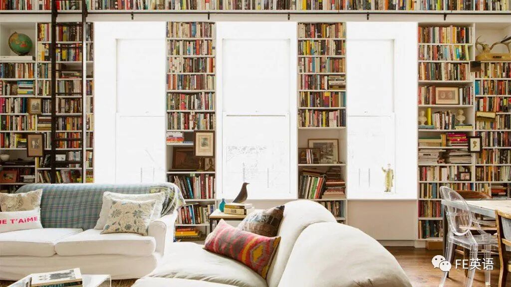 ① 句意:书架是必须的,我是说那些长到天花板的,我需要用梯子才能拿到书的书架。