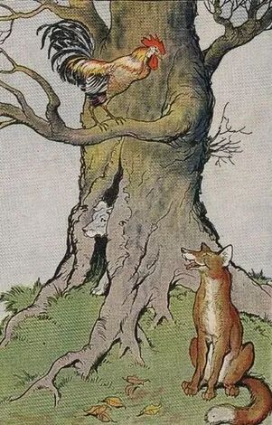 'Hey, Mr Fox, you wanted to trick me and gobble me up, but I tricked you instead!' clucked Cockerel.