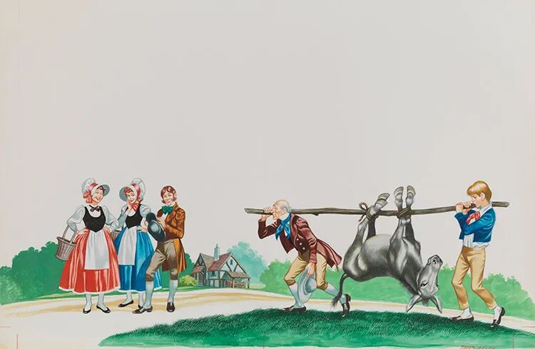 ‘Yes, they are right,’ thought the miller, and climbed down. ‘Get down, son. We’ll carry him between us.’ They tied the donkey’s legs to a pole, the donkey slung between them.
