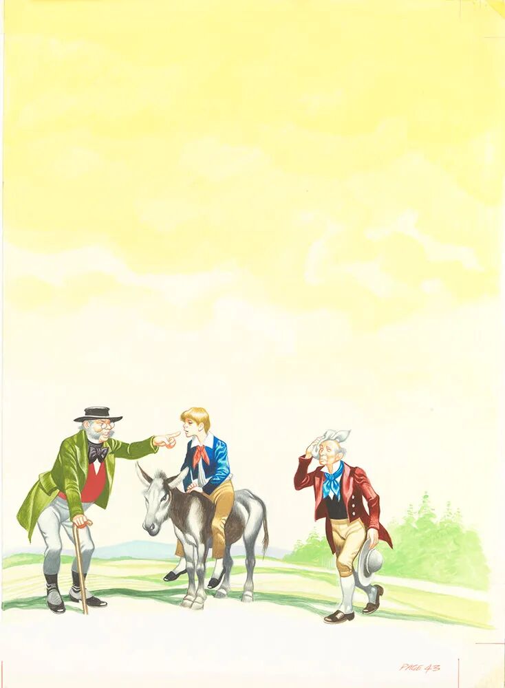 So the son climbed down and helped his father clamber up. ‘Ee-aw!’ grumbled the donkey, as the miller landed on his back. ‘What a lump. Worse than a sack of potatoes.’