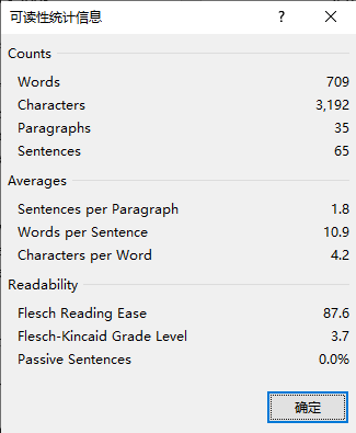 上图是用Word 2019检测出来的本故事文本适用年级信息,其中Flesch-Kincaid Grade Level=。一般来说,中国学生的阅读能力比英美学生落后4-6年。按照中位值,+5=年级,相当于国内使用人教版统编英语教材的六七年级学生。上海地区的小朋友四五年级即可试读本故事。