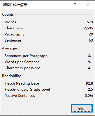 上图是用Word 2019检测出来的本故事文本适用年级信息,其中Flesch-Kincaid Grade Level=2.5。一般来说,中国学生的阅读能力比英美学生落后4-6年。按照中位值,2.5+5=7.5年级,相当于国内使用人教版统编英语教材的七八年级学生。上海地区的小朋友五六年级即可试读本故事。