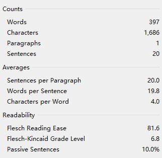 上图是用Word 2019检测出来的本故事文本适用年级信息,其中Flesch-Kincaid Grade Level=6.8。一般来说,中国学生的阅读能力比英美学生落后4-6年。按照中位值,6.8+5=11.8,相当于国内使用人教版统编英语教材的十二年级学生。上海地区的小朋友十年级即可试读本故事。