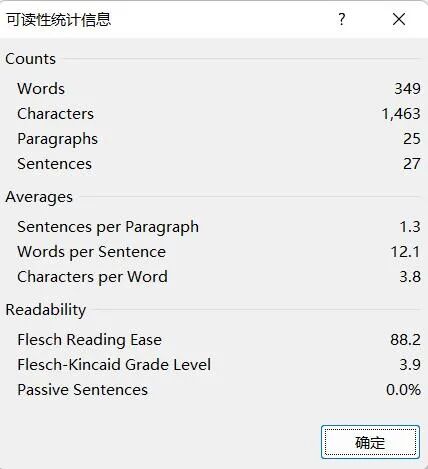 上图是用Word 2019检测出来的本故事文本适用年级信息,其中Flesch-Kincaid Grade Level=3.9。一般来说,中国学生的阅读能力比英美学生落后4-6年。按照中位值,3.9+5=9年级,相当于国内使用人教版统编英语教材的八九年级学生。上海地区的小朋友六七年级即可试读本故事。