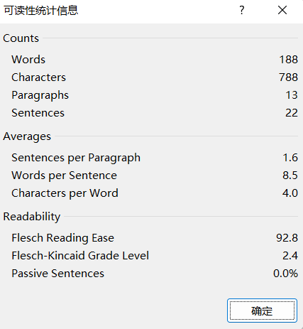 上图是用Word 2019检测出来的本故事文本适用年级信息,其中Flesch-Kincaid Grade Level=2.4。一般来说,中国学生的阅读能力比英美学生落后4-6年。按照中位值,2.4+5=7.4年级,相当于国内使用人教版统编英语教材的七八年级学生。上海地区的小朋友五六年级即可试读本故事。