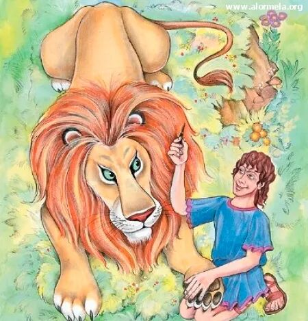 Androcles jumped to his feet and standing right in front of him was a huge Lion. He was about to run away when he noticed the lion was holding out his paw...and...he wasn’t really roaring...he was crying because a huge thorn was sticking out of his paw.