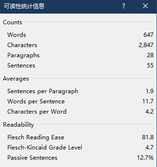 上图是用Word 2019检测出来的本故事文本适用年级信息,其中Flesch-Kincaid Grade Level=。一般来说,中国学生的阅读能力比英美学生落后4-6年。按照中位值,+5=年级,相当于国内使用人教版统编英语教材的六七年级学生。上海地区的小朋友四五年级即可试读本故事。