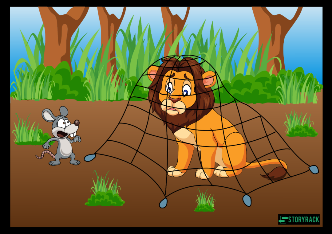 This time though, it wasn’t a roar of laughter but a roar of pain and fear. The Mouse crept closer to the terrible sound and saw the same Lion all tangled up in a hunter’s net. The more he struggled the more tangled up he became.
