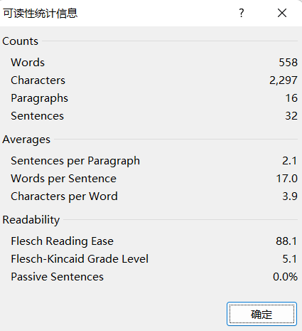 上图是用Word 2019检测出来的本故事文本适用年级信息,其中Flesch-Kincaid Grade Level=5.1。一般来说,中国学生的英语阅读能力比英美学生落后4-6年。按照中位值,5.1+5=10.1年级,相当于国内使用人教版统编英语教材的九十年级学生。上海地区的小朋友七八年级即可试读本故事。