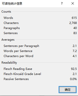 上图是用Word 2019检测出来的本故事文本适用年级信息,其中Flesch-Kincaid Grade Level=2.1。一般来说,中国学生的阅读能力比英美学生落后4-6年。按照中位值,2.1+5=年级,相当于国内使用人教版统编英语教材的五六年级学生。上海地区的小朋友三四年级即可试读本故事。