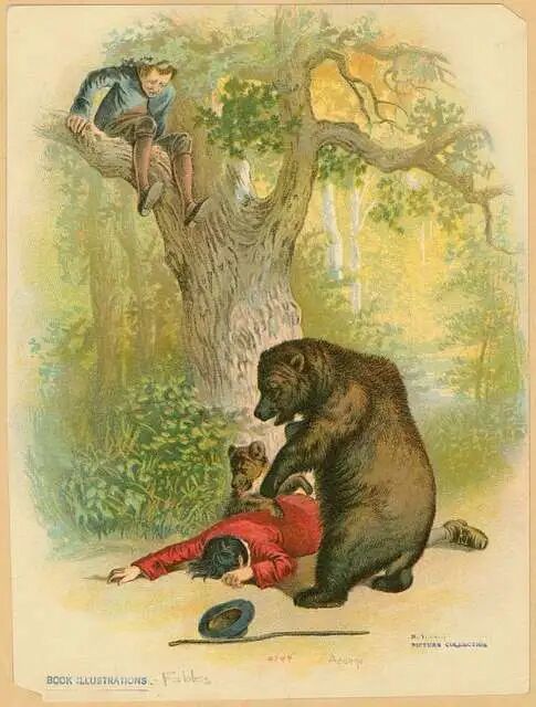 内容提要 : 一对好朋友穿过森林时遇到了熊,其中一位刚刚吹嘘他能打败熊的人立刻抛下同伴爬上了树。