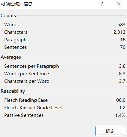 上图是用Word 2019检测出来的本故事文本适用年级信息,其中Flesch-Kincaid Grade Level=1.2。一般来说,中国学生的阅读能力比英美学生落后4-6年。按照中位值,1.2+5=6.2年级,相当于国内使用人教版统编英语教材的六七年级学生。上海地区的小朋友四五年级即可试读本故事。