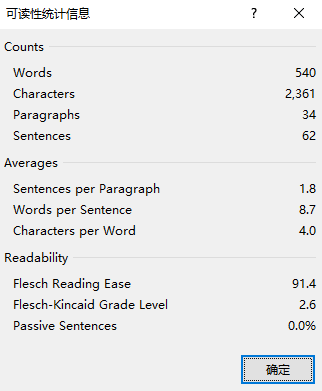 上图是用Word 2019检测出来的本故事文本适用年级信息,其中Flesch-Kincaid Grade Level=2.6。一般来说,中国学生的阅读能力比英美学生落后4-6年。按照中位值,2.6+5=7.6年级,相当于国内使用人教版统编英语教材的七八年级学生。上海地区的小朋友五六年级即可试读本故事。