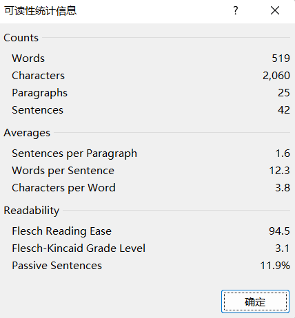 上图是用Word 2019检测出来的本故事文本适用年级信息,其中Flesch-Kincaid Grade Level=3.1。一般来说,中国学生的阅读能力比英美学生落后4-6年。按照中位值,3.1+5=8.1年级,相当于国内使用人教版统编英语教材的七八年级学生。上海地区的小朋友五六年级即可试读本故事。