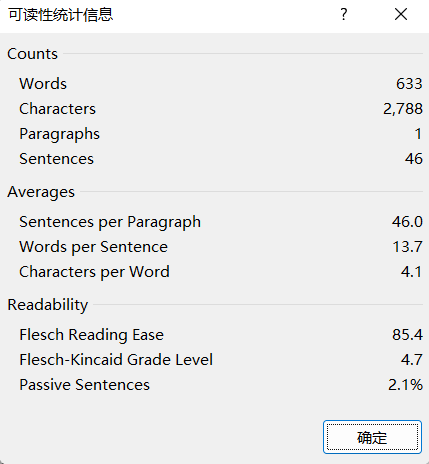 上图是用Word 2019检测出来的本故事文本适用年级信息,其中Flesch-Kincaid Grade Level=4.7。一般来说,中国学生的英语阅读能力比英美学生落后4-6年。按照中位值,4.7+5=9.7年级,相当于国内使用人教版统编英语教材的九十年级学生。上海地区的小朋友七八年级即可试读本故事。