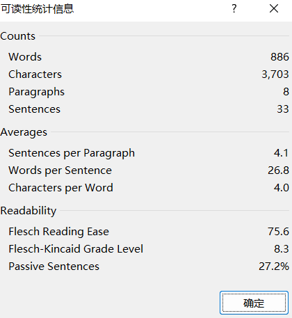 上图是用Word 2019检测出来的本故事文本适用年级信息,其中Flesch-Kincaid Grade Level=8.3。一般来说,中国学生的英语阅读能力比英美学生落后4-6年。按照中位值,8.3+5=13.3年级,相当于国内的大一大二学生。上海地区的小朋友高一高二即可试读本故事。