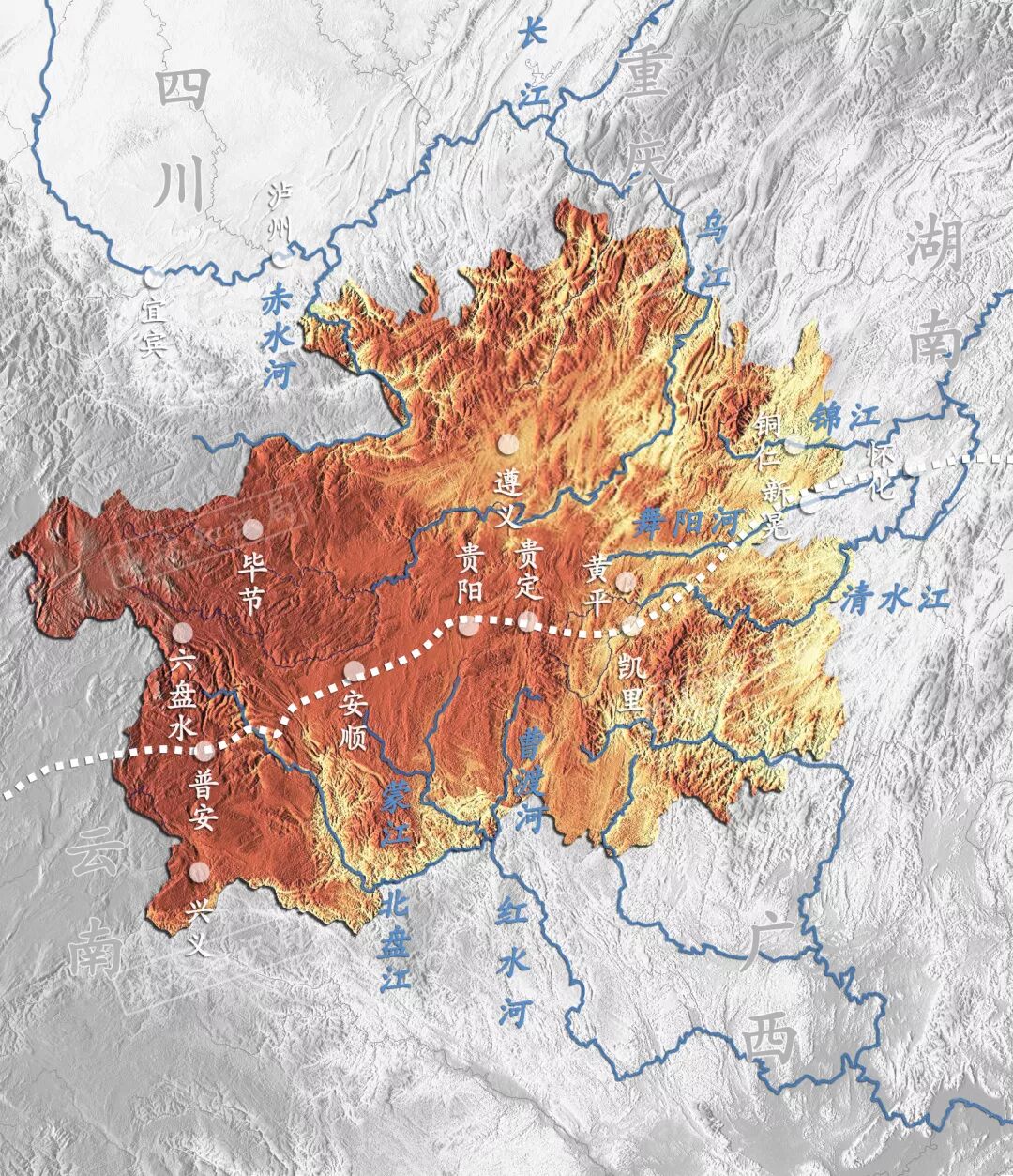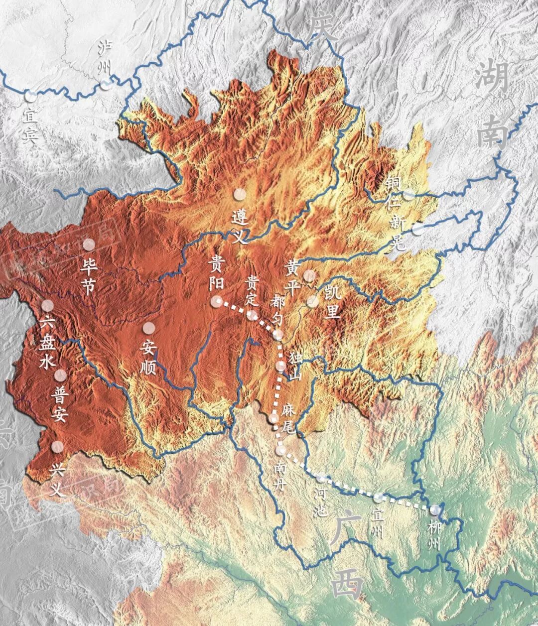 在贵州的北部,大娄山自西向东北斜贯于此,限制着川黔的交通往来;而东北面的武陵山,则由湖南蜿蜒入境,制约着这里与南方重要粮食产地的联系;西部高耸的乌蒙山,也束缚着这里与云南广大地区的连通。即便是贵州的内部,也有苗岭横亘于广大中南部地区,使得过去贵州内部区域的经贸往来十分有限。